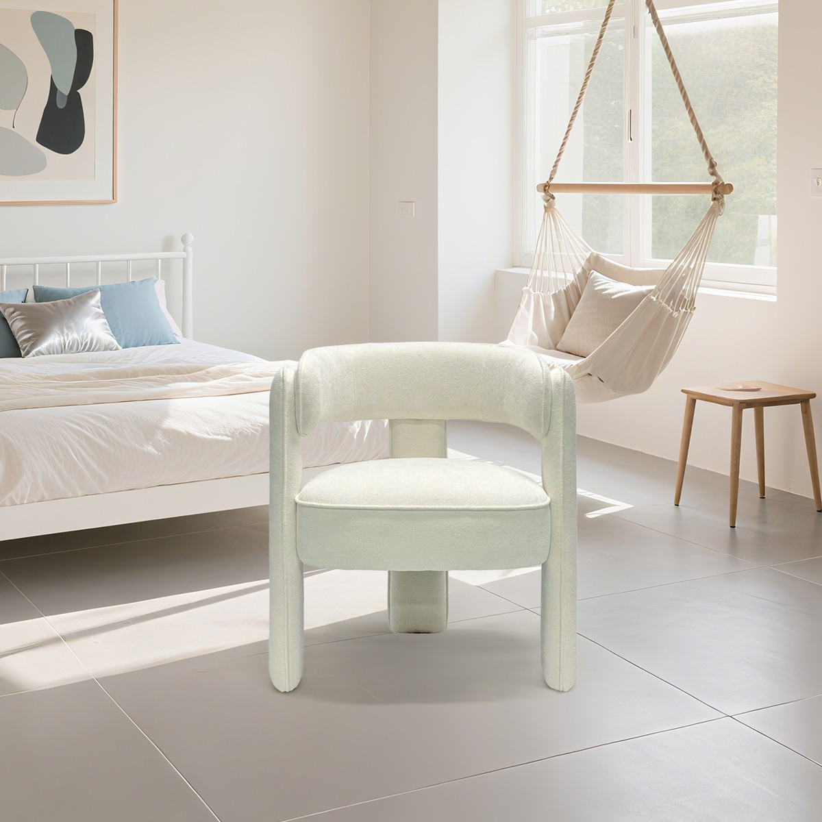 Modern fehér Boucle hordós akcentus szék nyitott háttal – kárpitozott étkező-nappali fotel