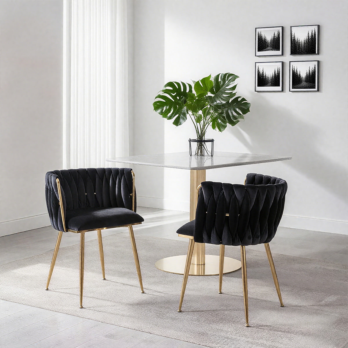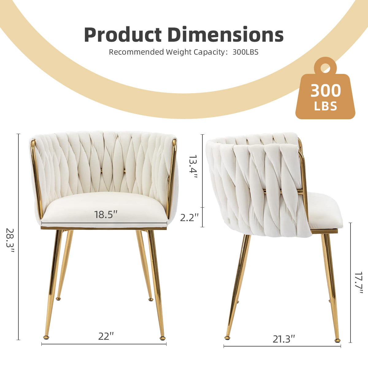 Ez az elefántcsont bársony kárpitozott étkezőszék szőtt háttámlával egy sokoldalú modern akcentus szék, kozmetikai zsámoly és a század közepén készült oldalszék. Luxus bársony szövettel, aranyszínű fém lábakkal, ergonomikus háttámlával és nagy sűrűségű hab párnákkal rendelkezik, így a kényelem és a stílus jegyében egyaránt megvan. Ideális étkezőkbe, nappalikba, hálószobákba, mosdókba, irodákba, kávézókba és szállodákba, mind az otthoni felhasználók, mind a kereskedelmi vásárlók igényeit kielégíti.