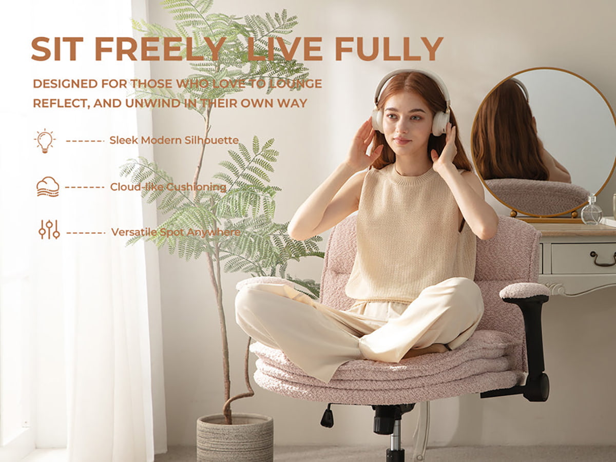 A felhajtható kartámaszok maximalizálják a rugalmasságot – üljön keresztbe, oldalra, összegömbölyödve vagy egyenesen. Ez a szék a kényelem, a mozgás és a stílus jegyében készült, és tökéletesen alkalmas otthoni irodákba, hálószobákba és kreatív terekbe.