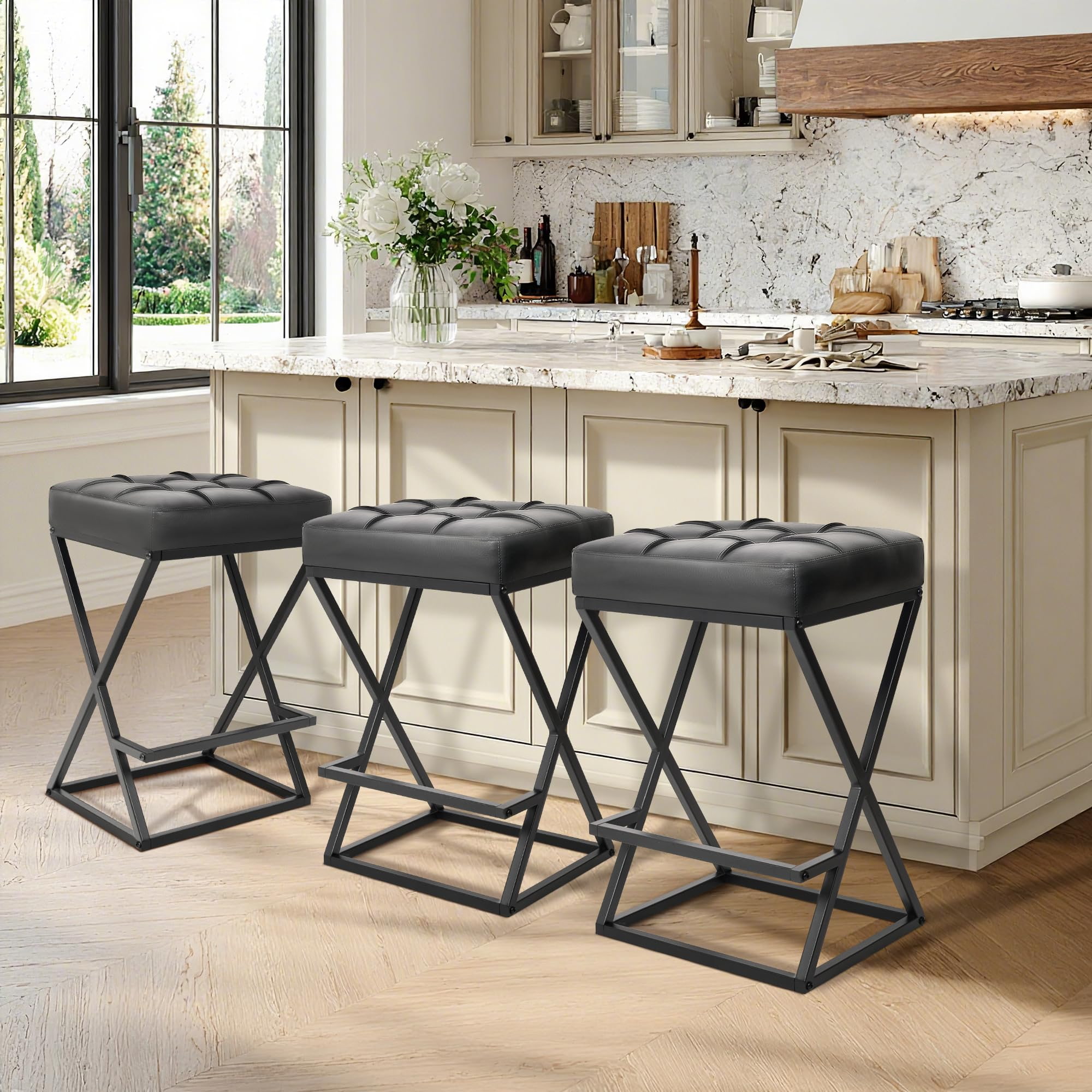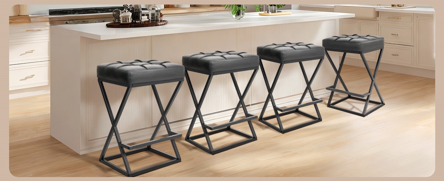 Pult magasságú, háttámla nélküli bárszékek kárpitozott bőrüléssel, X-Keret fém stabilitással, lábtartóval a Kitchen Islands Black számára