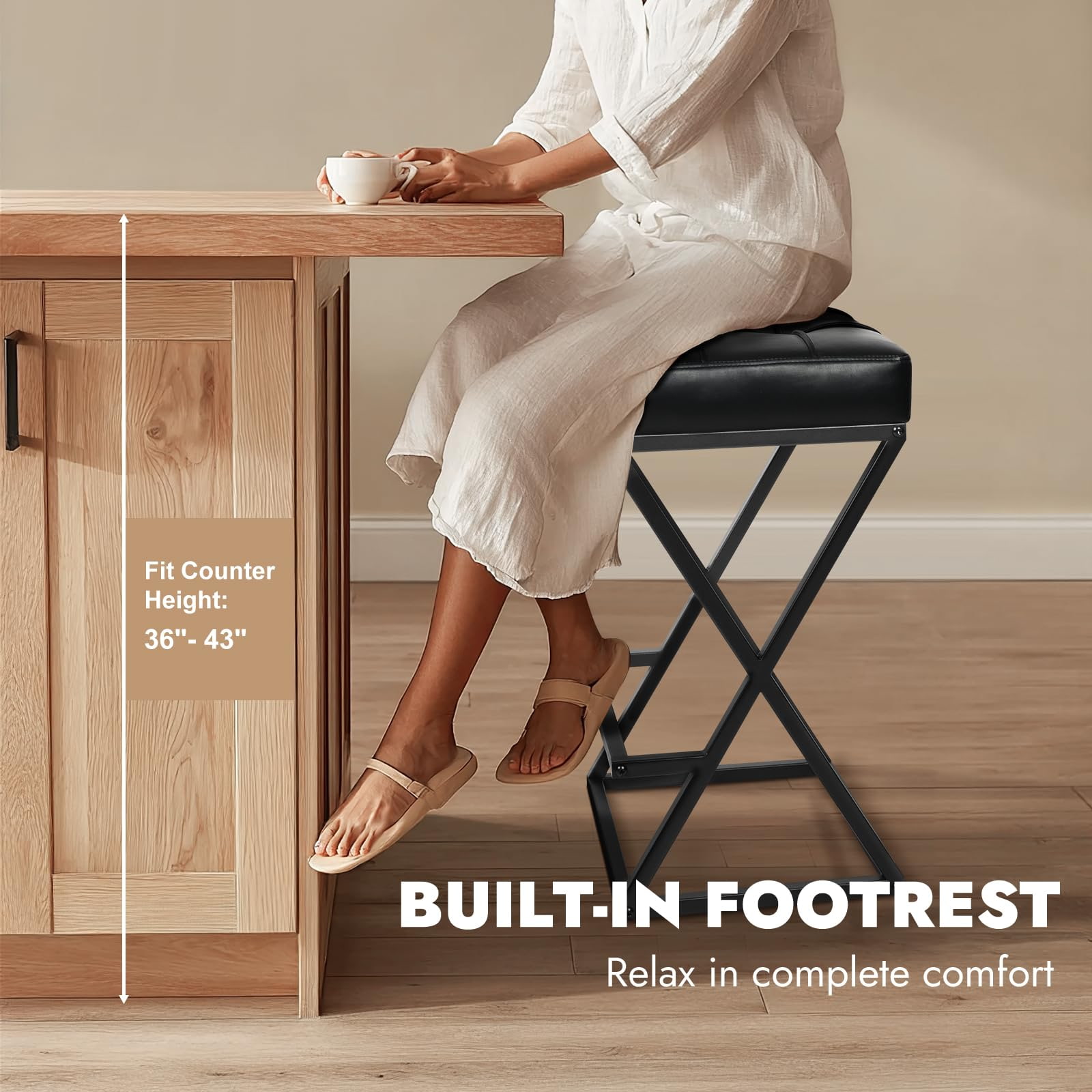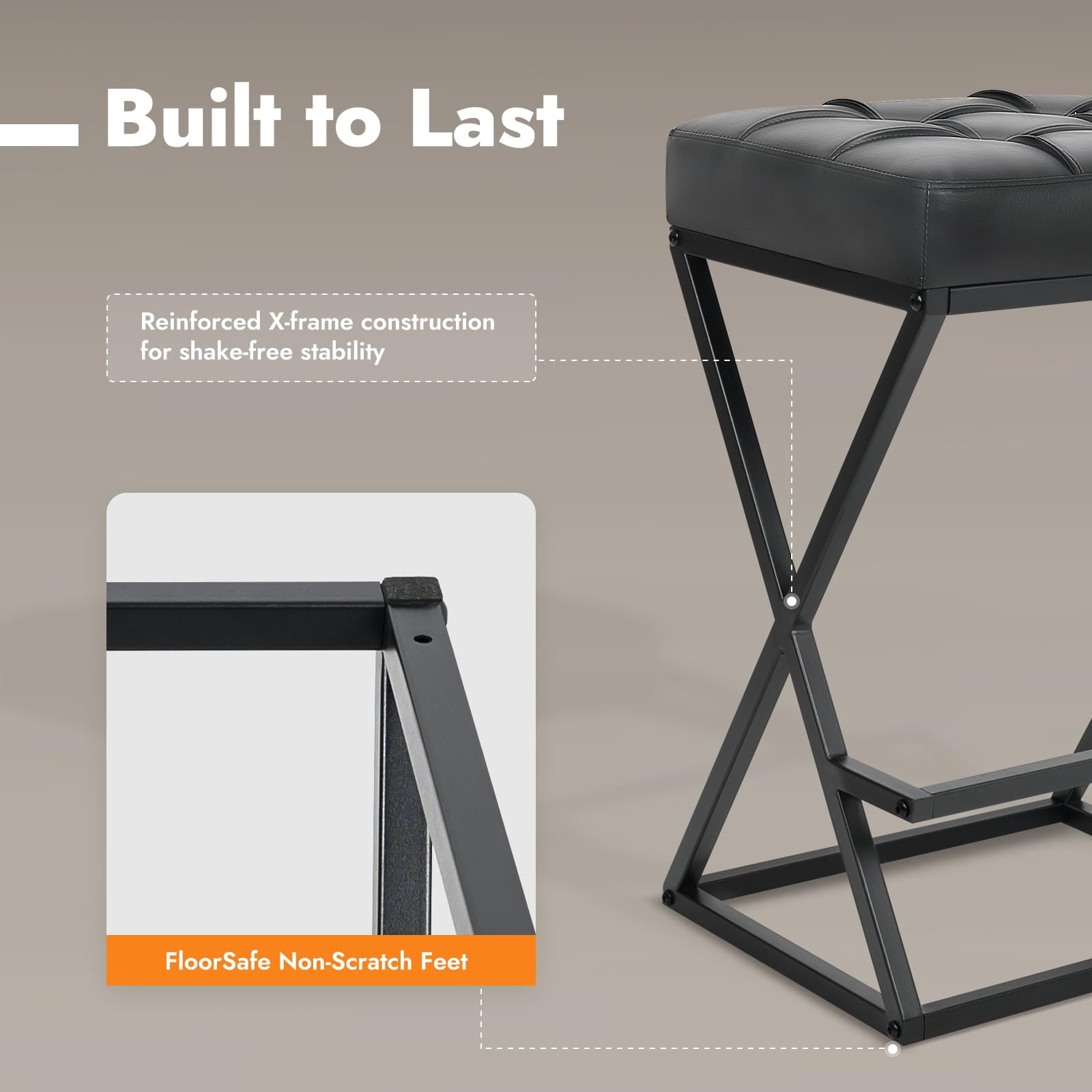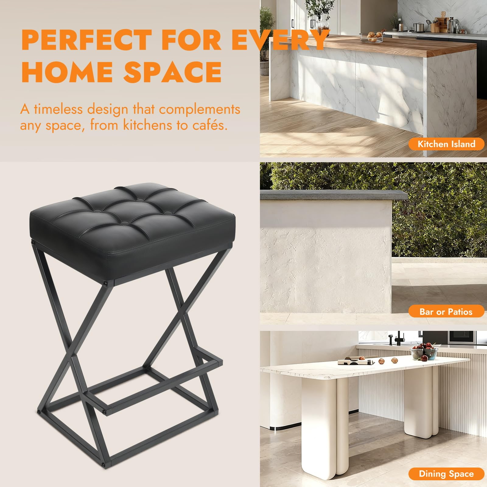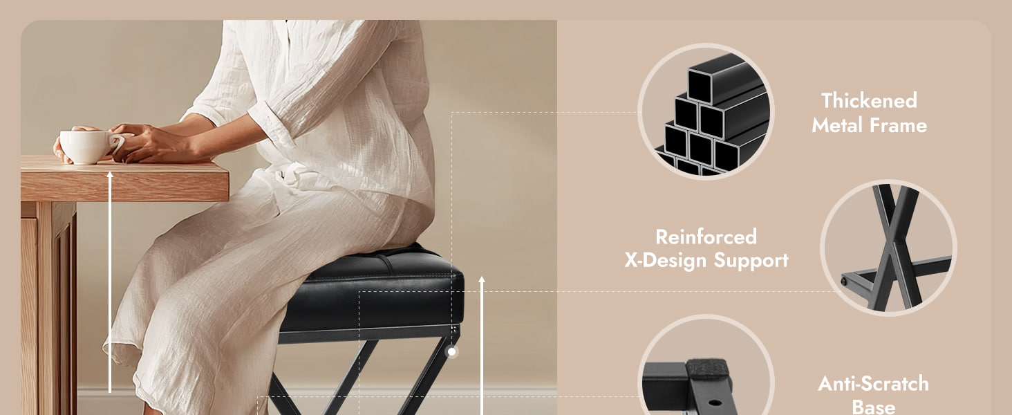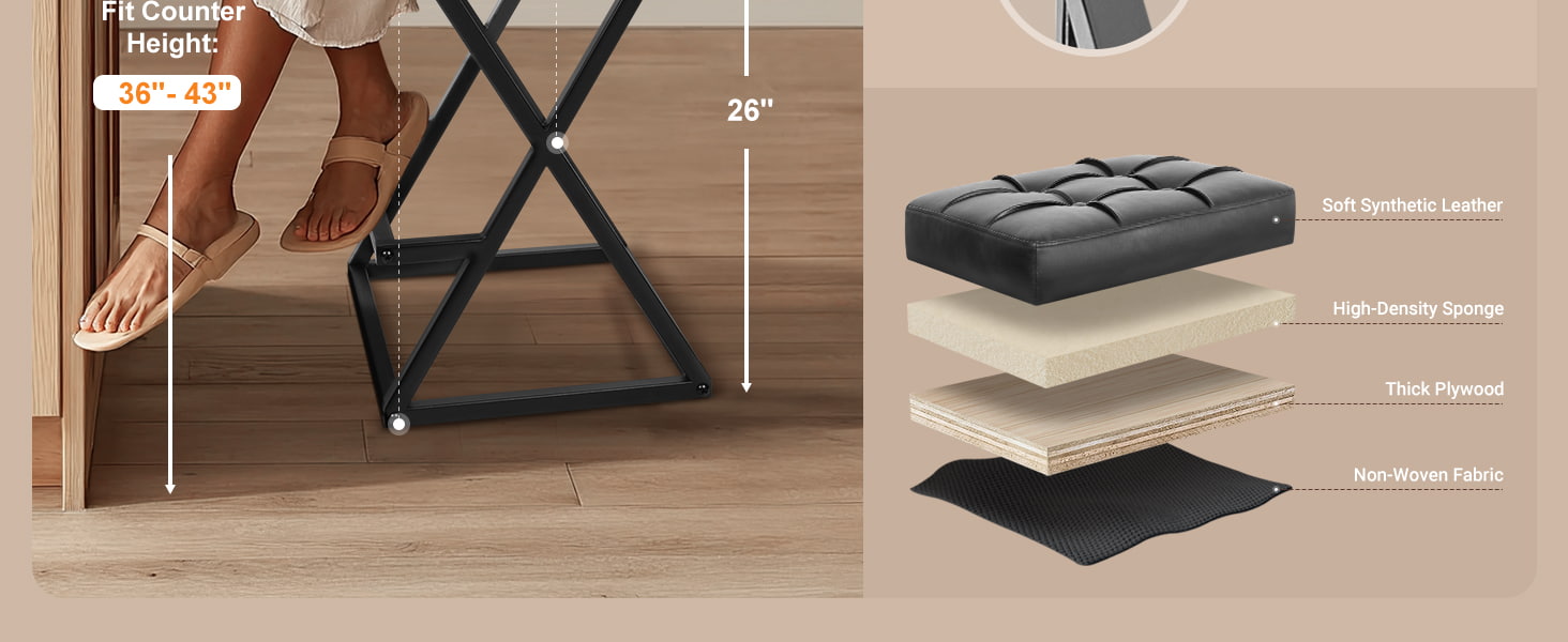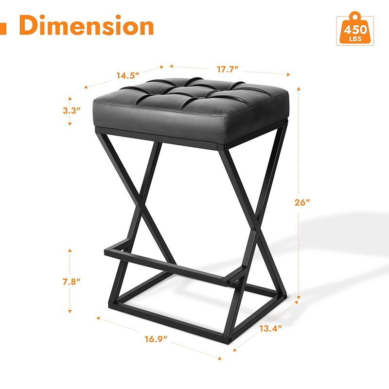 Ez a pult magasságú, háttámla nélküli bárszék, amelyet mind a lakossági, mind a könnyű kereskedelmi környezethez terveztek, megerősített X-vázas fémszerkezettel, nagy sűrűségű habszivacs párnázott műbőr üléssel és kompakt alapterülettel rendelkezik, amely ideális konyhákhoz, apartmanokhoz, kávézókhoz és vendéglátó-ipari projektekhez. A 26 hüvelykes ülésmagasság a szabványos konyhai szigetekhez és pultokhoz illeszkedik, míg a háttámla nélküli kialakítás lehetővé teszi, hogy a zsámoly teljesen alá csússzon, maximalizálva a hasznos helyet.
